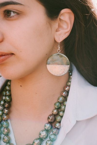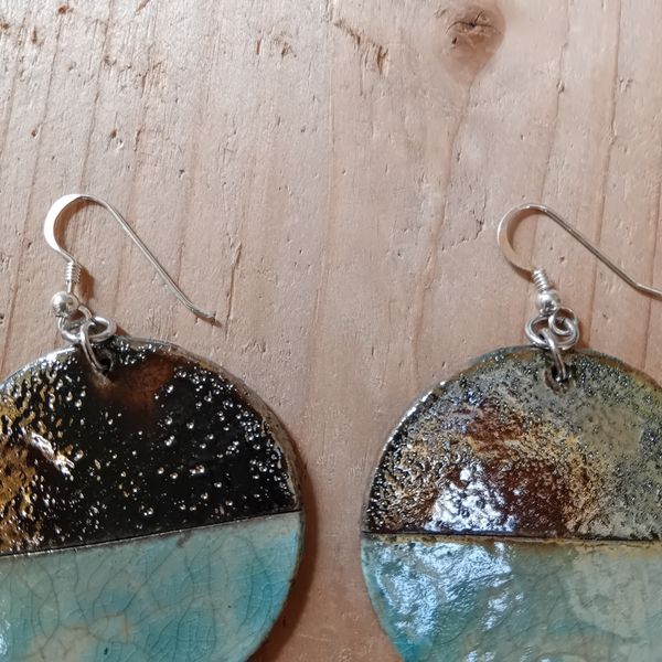 Orecchini pendenti realizzati in ceramica raku di colore turchese e oro blu
